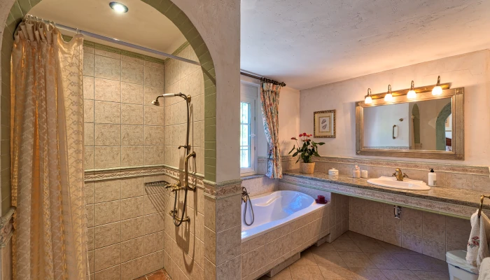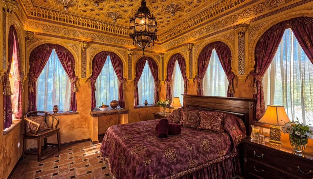 Accommodation consists of individually designed luxury suites with private en-suite bathrooms. Communal areas support daily routines, therapy sessions, and shared activities. Outdoor facilities include a swimming pool, terraces, and walled gardens surrounded by palm trees, offering space for reflection, rest, and gentle activity within the daily schedule.