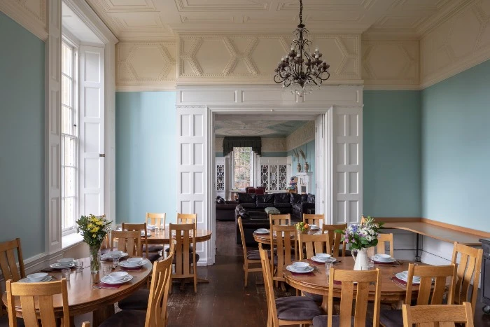 Rooms offer views across the surrounding countryside, contributing to a calm daily setting. Communal spaces are used for therapy sessions, group activities, and shared meals, reinforcing the community-focused nature of the programme. Outdoor access includes sweeping grounds suitable for walks and quiet time as part of daily routine.
