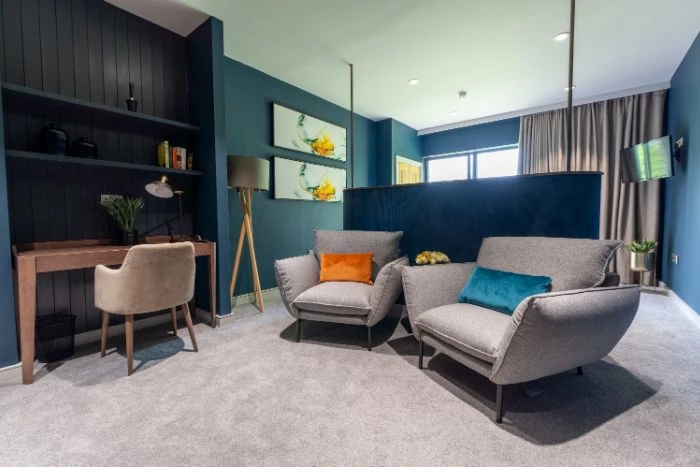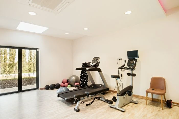 Accommodation includes attractively designed bedrooms with en-suite bathrooms, alongside comfortable communal spaces used for therapy and daily interaction. Wellness facilities include an art studio, gymnasium, yurt, and a private movie theatre, supporting structured activity and reflection within the residential setting.
