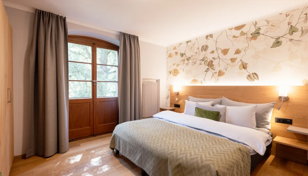 Outdoor and wellness facilities include access to a wellness park with a swimming pool, heated outdoor whirlpool, Finnish sauna, and bio sauna. The surrounding lakeside and mountain environment forms part of daily routines through guided walks and restorative downtime.